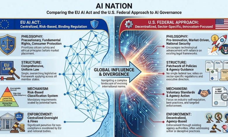 The EU AI Act and the U.S. federal approach to AI governance represent two contrasting philosophies in regulating artificial intelligence.